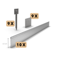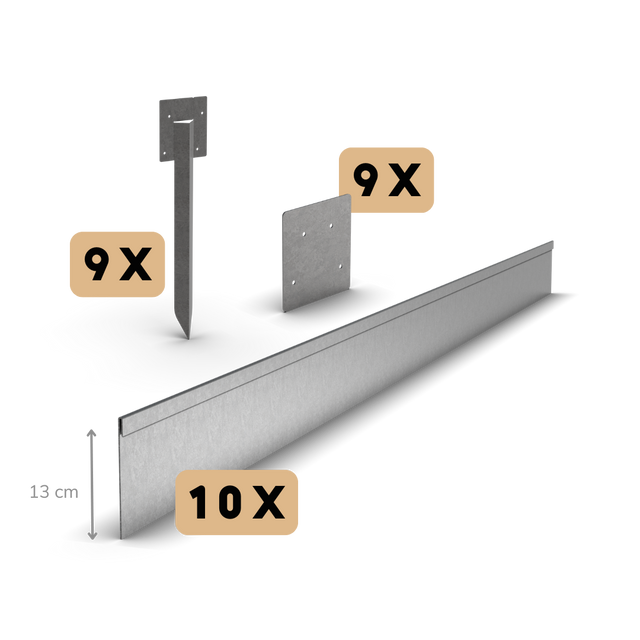 Je ontvangt 9 koppelplaten en 9 grondpinnen om de borderrand te bevestigen en stevig in de grond te zetten. Totaal voor 23 meter.