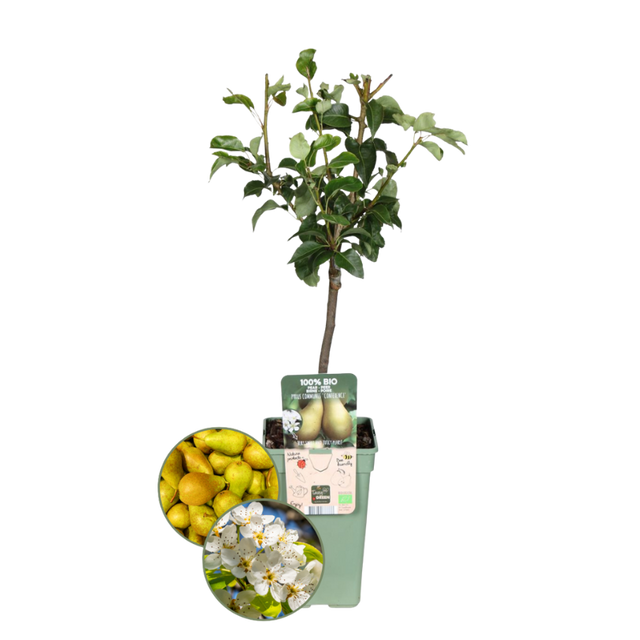 Le poirier biologique (Pyrus communis) est un arbre fruitier classique appartenant à la famille des rosacées (Rosaceae). Cet arbre spécifique est issu de l'agriculture biologique, ce qui signifie qu'il a été cultivé dans le respect de la nature, sans utilisation de pesticides chimiques de synthèse ni d'engrais artificiels. Grâce à ce mode de culture, l'arbre développe une santé robuste et vous contribuez à un environnement plus durable.